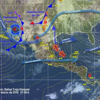 CIUDAD DE MÉXICO (08/MAR/2016).- Durante las próximas horas continuará el descenso de temperatura acompañado de lluvias de fuertes a muy fuertes y rachas de viento debido a los efectos del frente frío número 44 y la 11 tormenta invernal que afecta al noroeste de México.