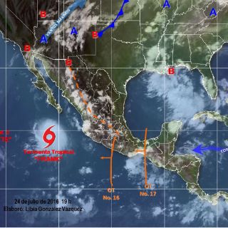 CIUDAD DE MÉXICO (24/JUL/2016).- Un canal de baja presión localizado en el interior de México, las ondas tropicales números 16 y 17, ubicadas en el sur y el sureste del territorio nacional, y la tormenta tropical '
