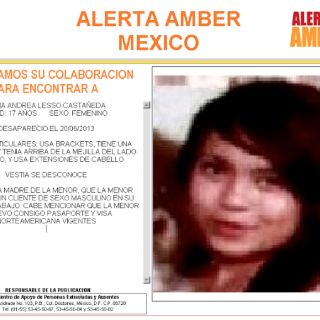 CIUDAD DE MÉXICO (24/JUN/2013).- La Secretaría de Seguridad Pública del Distrito Federal (SSPDF) hizo un llamado a la sociedad en general para localizar a Alma Andrea Lesso Castañeda, de 17 años de edad, desaparecida el pasado 20 de junio en León, Guanajuato.