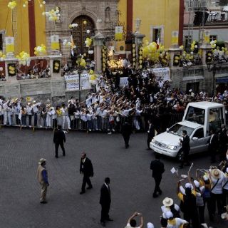 Procedente de León, donde se hospeda, el máximo jerarca de la Iglesia Católica cambió de vehículo en la Puerta Santa Fe, al ingreso de la capital guanajuatense, dejando el automóvil cerrado para abordar el famoso jeep blanco.