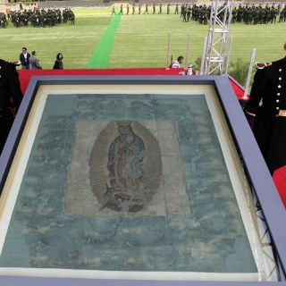 Los dos lienzos son de tafetán celeste con la Virgen de Guadalupe en el anverso y el águila, que simboliza la fundación de Tenochtitlan, en el reverso.