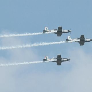 Ocho aviones T-6C formados como flecha cruzaron en medio de los helicópteros, sonó el Himno Nacional y el espectáculo inició formalmente.