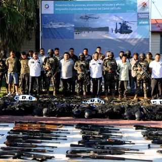 CIUDAD DE MÉXICO/ SAN PEDRO, COAHUILA (06/OCT/2010).- La Armada de México presentó este martes en Matamoros, Tamaulipas, a 17 presuntos integrantes del cártel del Golfo, a quienes les fue asegurado un arsenal compuesto por armas largas, granadas, más de 100 mil municiones, así como droga, 42 vehículos y equipos de comunicación.
