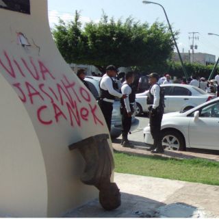 Integrantes del Frente Campesino Independiente "Emiliano Zapata" derribaron el busto del extinto ex secretario de Gobernación, Juan Camilo Mouriño Terrazo, colocado en el Paseo de los Héroes del Barrio de San Román.
