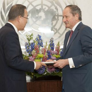 NUEVA YORK, ESTADOS UNIDOS (23/JUL/2013).- Al presentar sus cartas credenciales como representante permanente de México ante Naciones Unidas al secretario general de este organismo, Ban Ki-moon, el embajador Jorge Montaño reiteró el compromiso de México con los propósitos y principios de la ONU.