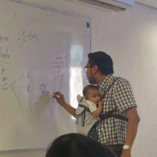 Cuando el maestro estaba dando la clase el bebé se puso a llorar. Su mamá no podía tenerlo y atender la clase, por lo que decidió cargarlo.