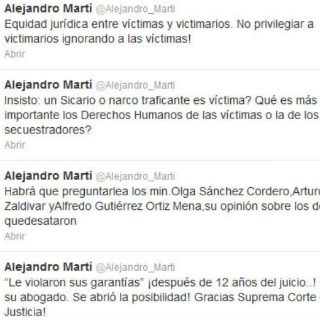 En seis tuits Martí, recordó que a 12 años del juicio de los secuestradores de Galindo uno se amparó, y acusa que “Gracias Suprema Corte de Justicia” se abrió dicha posibilidad, en referencia a la liberación de la ciudadana francesa, Florence Cassez.