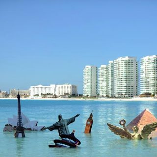 La Estatua de la Libertad; la Torre Eiffel; el Big Ben, la pirámide de Giza, el Taj Mahal, el Cristo Redentor de Río de Janeiro y el Ángel de la Independencia de la Ciudad de México, fueron sumergidos parcialmente por Greenpeace en Cancún para ilustrar los riesgos por el calentamiento global. “La creciente marea afectará a todos, ya sean ricos o pobres. Aquí en Cancún los ministros deben elegir en navegar hacia un futuro seguro que no dependa de combustibles fósiles que están cambiando el clima del planeta”, señaló