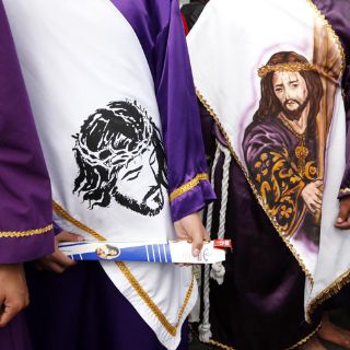 Con pesadas cruces a cuestas, hombres, mujeres y niños, vestidos con túnicas moradas, que calzan guaraches, sandalias o andan descalzos, están listos para participar en la caminata por las principales calles de los ocho barrios de la delegación en un recorrido de alrededor de ocho kilómetros con el que inician las actividades conmemorativas del Viernes Santo en Iztapalapa.