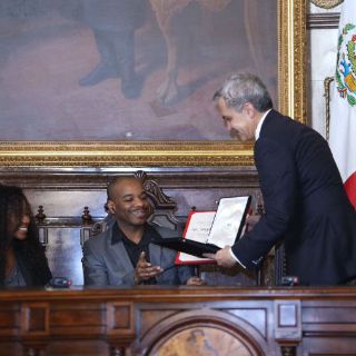 En el Salón de Cabildos del Antiguo Palacio del Ayuntamiento, el mandatario capitalino entregó el pergamino y medalla a Wiltshire, quien visita la Ciudad de México para dibujarla en un lienzo de cuatro metros con la ayuda de su memoria.