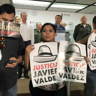En un breve encuentro con comunicadores para dar a conocer los acuerdos, periodistas locales con pancartas en las que exigían "justicia para Javier Valdez", se colocaron frente a los funcionarios locales y federales que acompañaron a Osorio Chong.