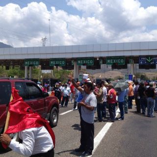 Con pancartas con los rostros de los normalistas, víctimas de desaparición forzada desde septiembre de 2014, los manifestantes realizan una valla humana impidiendo el paso de los transportes de carga y de automóviles particulares.