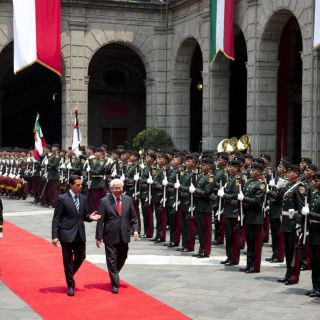En el Patio Central del recinto, entonaron los himnos nacionales de ambos países, se hizo la presentación de las comitivas oficiales y pasaron revista a las tropas de honor.