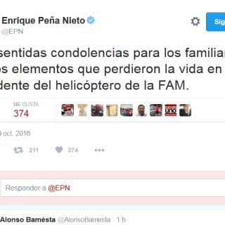 CIUDAD DE MÉXICO (10/OCT/2016).- El Presidente Enrique Peña Nieto lamentó la muerte de los elementos de la Fuerza Aérea Mexicana, cuando sufrió un accidente a ocho kilómetros al este de Ciudad Victoria, en Tamaulipas.