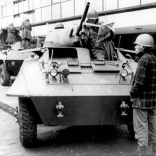 En la fotografía se ven dos tanques y al menos cuatro militares que se encontraban en la Plaza de las Tres Culturas.