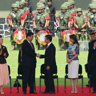 Durante la ceremonia oficial de recepción, los presidentes de México y China pasaron revista a contingentes de la Heroica Escuela Naval Militar, del Colegio Militar y de la Escuela del Aire, así como a personal de fuerzas especiales paracaidistas e infantería del Ejército mexicano.