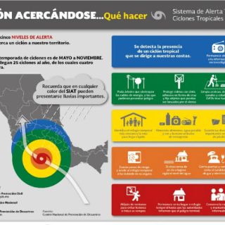 En una infografía, el Sistema Nacional de Protección Civil (SNPC) detalla los grados de prevención para la población en esta época de ciclones tropicales que se emiten a través del Sistema de Alerta Temprana (SIAT) y que están clasificados en colores.