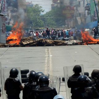En el sitio, civiles embozados lanzaron cohetones, destruyeron e incendiaron las carpas de plásticos que los simpatizantes de la CNTE utilizaban como campamentos a un costado de la carretera.