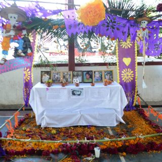 Organizaciones como el Taller de Desarrollo Comunitario (Tadeco), dedicado a la búsqueda de desaparecidos y la Coordinadora Estatal de Trabajadores de la Educación del Estado Guerrero (CETEG) colocaron la ofrenda por el Día de Muertos para recordar a gente que murió a balazos. Arriba de la ofrenda se observó la manta con personas desaparecidos y otras que murieron tras ser secuestradas.