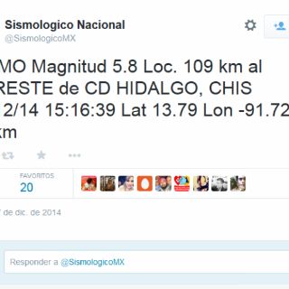 En un reporte preliminar emitido en su cuenta en Twitter @SismologicoMX indicó: "Preliminar: SISMO Magnitud 6.4 Loc. 153 km al SURESTE de CD HIDALGO, CHIS 07/12/2014 15:16:41 Lat 13.81 Lon -91.05 Pf 10 km". Sin embargo momentos después ajustó la cifra a 5.8 grados en esa escala abierta.