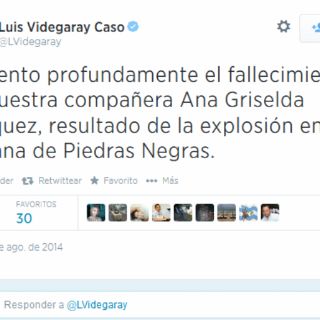 A través de su cuenta de Twitter, el funcionario federal expuso: "Nuestras sinceras condolencias para la familia de Ana Griselda, y deseamos una pronta recuperación a los compañeros heridos en la explosión".
