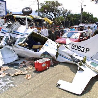 TIJUANA, BAJA CALIFORNIA (31/OCT/2011).- La caída de una avioneta sobre un taller de carrocerías ubicado en la calle Pino de la colonia Libertad, dejó como saldo tres personas muertas; dos eran tripulantes y otra una persona que bajaba de un automóvil al momento del choque.