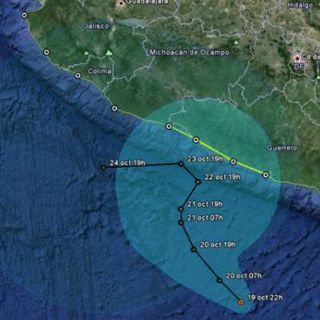El fenómeno se encuentra a 330 kilómetros al sur de Acapulco, Guerrero, y a 470 kilómetros al sureste de Lázaro Cárdenas, Michoacán y se desplaza al noroeste a 13 kilómetros por hora con vientos sostenidos de 55 kilómetros por hora con rachas de hasta 75 kilómetros por hora.