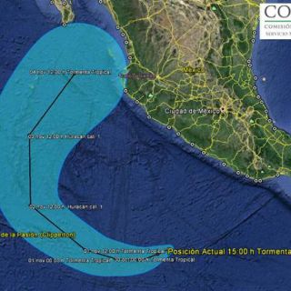 El meteoro registra vientos sostenidos máximos de 65 kilómetros por hora y se desplaza en dirección oeste a ocho kilómetros por hora. Está a unos 670 kilómetros (415 millas) al sur del puerto turístico de Acapulco.