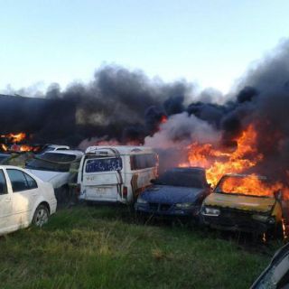 incendio de pastizales en un predio cercano que se extendió, decenas de vehículos se encuentran ardiendo en un retén de la empresa Grúas Pérez que se ubica en la Ranchería Anacleto Canabal cuarta sección, en la carretera Villahermosa-Cárdenas.