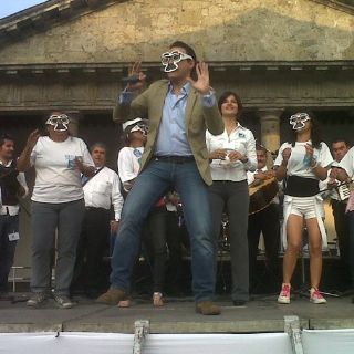 GUADALAJARA, JALISCO (10/JUN/2012).- Con un ambiente musical, simpatizantes del Partido Nueva Alianza permanecen en la explanada del Instituto Cultural Cabañas, en apoyo a sus candidatos, principalmente por Gabriel Quadri, quien aspira a la presidencia del país.