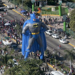 "Mamá, mamá es Batman, está bien grande, mamá, mira, mira que bonito", gritaba un niño a su progenitora al ver pasar al Caballero de la Noche vestido de azul y de más de 20 metros de altura.