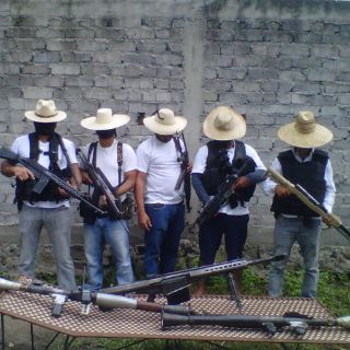 En la fotografía aparecen cinco hombres con camiseta blanca, como la que usaban los grupos de autodefensa; todos llevan sombrero y algunos portan chalecos antibalas.