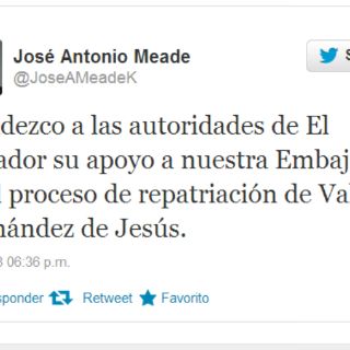 La Cancillería agradeció a las autoridades de El Salvador por "su invaluable ayuda en este caso, así como a la Procuraduría General de Justicia del estado de México que dará seguimiento a la denuncia presentada por la señora de Jesús", destacó el comunicado. Mientras que el titular de la SRE, José Antonio Meade escribió en Twitter: "Agradezco a las autoridades de El Salvador su apoyo a nuestra Embajada en el proceso de repatriación de Valeria Hernández de Jesús".