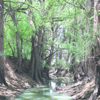 Las orillas verdes estaban salpicadas por preciosas flores blancas con lila, cada tallo con un ramillete. Había sabinos con cinco troncos que se anudaban formando uno, otros mostraban sus curveadas raíces, que bajaban al lecho. Mis pasos los escucharon patos, que levantaban vuelo y graznaban. Continué mi andar y el sendero fue sombreado por la alameda de La Cofradía.