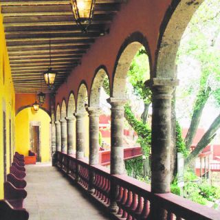 De la capilla nos dirigimos a “El Chorro”, el sendero empedrado fue serpenteando una atractiva loma boscosa, donde se ocultaba la hermosa finca denominada, “El Chorro”, responsable de la dotación de agua. La familia De la Canal patrocinó el entubamiento, que fue inaugurado en 1750, tubos que saciaron varias pilas y fuentes, de las cuales prevalecen la de la calle Camino Real y la de La Quebrada, y por supuesto llenaron el canal de los lavaderos comunales . Entre unas escaleras vimos una pila con volutas y un medallón. La escalera izquierda nos llevó a un patio delimitado por puertas con respiradero circular, entre ellas se anunciaba: “Casa de la Cultura San Miguel Allende”. El patio nos invitó a un atractivo portal, conformado por siete arcos en medio punto, soportados por capiteles dóricos y columnas redondas, unidas por una balaustrada. Ocupamos una banca del portal para percibir la arquitectura y la vista. Atrás del portal se levantó una torre con cuatro columnas, en medio se lee: “Año de 1801”, arriba de la cornisa posa un reloj y por remate, una cruz. Atrás de los cuartos del patio se construyó un bonito edificio, de dos pisos con ventanas verticales y tres balcones, que miran al esplendido follaje.