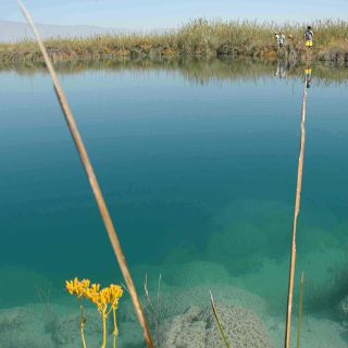 Después visitamos las lagunas de la región, a invitación de los propietarios de los predios donde están: Puente Zumbadora, Los Burros, El Hundido, La Becerra, Churince, y la impresionante Poza Azul… ¡Ah, qué bonita! Chiquita; tendrá unos veinte metros de diámetro y doce de fondo. El agua es azul, azul; como si estuviera teñida, y tan clara que su fondo se alcanza a ver perfectamente. En ellas existen unos pececitos (Ciclids) que son endémicos de la región y se alimentan sepultándose en la arena para sacar pequeñas almejas, y luego de expulsar sus desechos se vuelven a enterrar por otro bocadillo.
