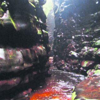 Nuestros pies se levantaban con la fuerza de la corriente, mientras que el deseo de llegar a la belleza prometida, nos hacía aferrarnos al dichoso cable que nos permitía mantener la cabeza fuera del torrente. Con un jalón y otro jalón avanzábamos en cortos tramos; y en los resquicios donde la corriente cedía, como si fuera una travesura, abríamos los brazos para tocar las dos paredes al mismo tiempo, regocijándonos tanto de la hazaña como de la sensación de estar abrazados por aquel caldo, limpio y tibio del color del té.