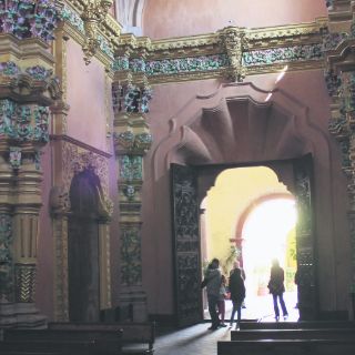 Del Museo de la Máscara, nos dirigimos al Museo Regional, era domingo y teníamos que aprovechar los museos. Recorrimos unas cuadras de bonitas fincas y entramos a la hechizante plaza, donde miramos una fuente de dos copas y al fondo una arcada de piedra aparente, que conducía a bodegas y caballerizas del convento, en el segundo nivel, cinco balcones, del costado derecho fuimos cautivados por una capilla elevada, flotada, con una preciosa ventana en el ábside y una señorial cúpula. La ventana, vertical y arqueada, en su base un niño suspendiendo la presión de las volutas, enmarcada por columnas estípites y rematada por una cara, más arriba, dos niños, al centro un nicho y una guardamalleta.
