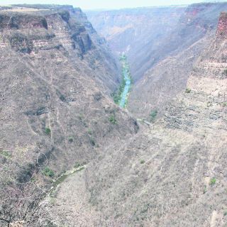 Abrí un falsete y giré a la izquierda para ir a un mirador, di unos pasos y fui maravillado por el hermoso cañón del río Verde, que serpenteaba entre manchones verdes, haciendo fabulosas tinajas. Me encontraba a 1,650 metros de altura sobre el nivel del mar, y el Verde canturreaba música de agua a 450 metros abajo, a penas se escuchaba la alegre música, gracias a las laderas del cañón, el correr del agua se emite para arriba, como anunciando su espectacular paso. Las paredes, bastante inclinadas y con pliegues hasta su tercera parte, luego casi verticales y con algunas marcas de niveles añejos. Posteriormente fui a otro mirador, río arriba, de donde lo aprecié corriendo al Oeste, después de curvear una loma, seguía derecho por un buen tramo, hasta perderse a la siniestra en un recodo.