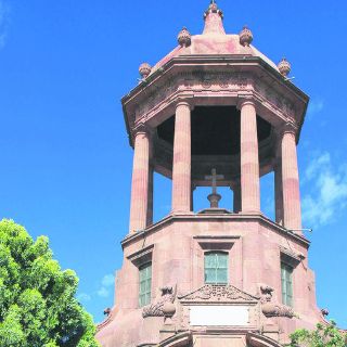 Luego fuimos atraídos por un vistoso mausoleo, de planta octagonal, alto y elegante, de cantera rosa. Delimitado por una barbicana con columnas redondas con almena y entre ellas, una reja. Dos puertas de fierro abren al sitio, al frente, una puerta entre columnas toscanas abre a la capilla.