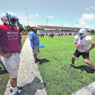 El Sol inclemente se estampa contra el pasto sintético. Los trabajadores de la construcción y sus máquinas generan murmullo mientras terminan los últimos detalles de la obra. “Mete la cadera”, se oye la voz de un entrenador. El jugador, ataviado con hombreras y casco, avanza unos 20 metros como cangrejo y luego regresa a su posición original. A pocos pasos de ahí, un hombre con traje oscuro y corbata roja corre para patear un balón ovoide en el campo Fortaleza Azul, el cual emprende un vuelo bajo por el costado de los goalposts.