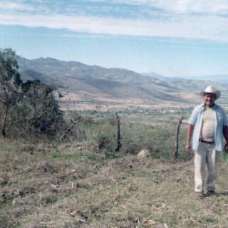 Entre a una tiendita a preguntar por las pirámides, y en eso llegó un alegre señor cantando sobre su bicicleta cargada de chayotes, era Hilario García Martínez, quien me ofreció enseñarme las pirámides. Atravesamos el atrio del santuario de la Virgen de Juan Diego, para entrar a un potrero, donde al fondo contemplamos la primera pirámide, a un costado de unos sauces y atrás de un lienzo de púas, estaba bien demarcada, era un altar, luego apreciamos una plataforma a un costado, de menores dimensiones, pero llena de energía, más adelante nos sorprendió un bosque de salates, con su atractiva corteza blanca, sus torcidas ramas y sus salientes raíces. A corta distancia nos cautivó una pirámide de buenas proporciones, en lontananza vimos el precioso cerro Grande de Ameca, pavoneándose de sus crestas. Enseguida apreciamos una plataforma un tanto alargada. Unos árboles delataban el cauce del arroyo Santa Cruz. Recorrimos otro potrero, que nos mostró añejos huizaches, los fabulosos palos resguardaban un ojo de agua, que alimentaba dos pilas rectangulares, bebimos la deliciosa agua zarca, enseguida vimos unos montículos.