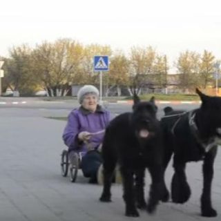 En el video se puede ver cómo Sofía Kalinina, una mujer rusa de 79 años de edad, se pasea a bordo de un carrito construido de forma simple con una base y cuatro ruedas, mismo que es tirado por sus dos perros.