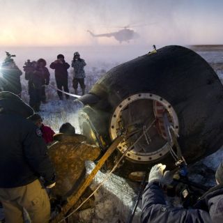 Imágenes de video en el lugar mostraron a la cápsula Soyuz, ennegrecida por el intenso calor al ingresar de regreso a la atmósfera, apoyada en uno de sus costados mientras los astronautas eran sacados.