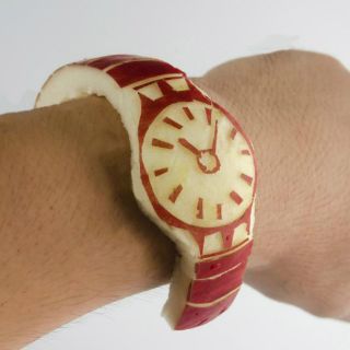 TOKIO, JAPÓN (12/SEP/2014).- No puede conectarse a ningún teléfono y ni siquiera da la hora, pero las imágenes de un falso Apple Watch -tallado a partir de una manzana de verdad- creado por un usuario japonés han sido retuiteadas más de 55 mil veces en solo dos días en la red social