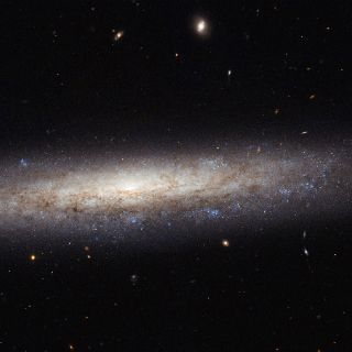 En la imagen se pueden observar varias franjas de polvo que oscurecen el bulbo central, además de cúmulos dispersos, puntos azules en los bordes de la galaxia, que marcan las zonas donde nacen las estrellas.
