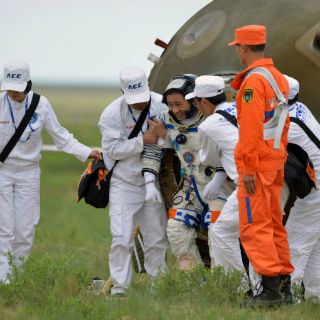Nie Haisheng, comandante de la tripulación de la Shenzhou X y que viajó al espacio por segunda vez, fue el primero en salir de la cápsula, seguido por Wang Yaping, la única mujer astronauta de la misión, y Zhang Xiaoguang.