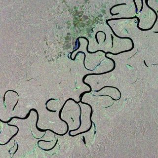 La imagen, capturada por el satélite Envisar entre los pasados 2 de enero, 1 de febrero y 3 de marzo y procesada por la Agencia Espacial Europea, muestra cómo el río penetra en un área, formando una serie de marcados meandros a su paso.