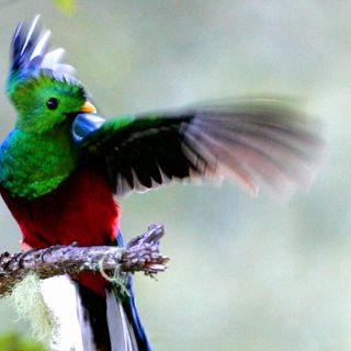 El Quetzal es un ave de tamaño mediano con plumaje verde iridiscente en el dorso.