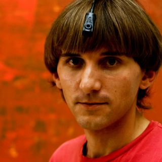 "El primer eyeborg fue con una cámara en la cabeza, unos cascos y un ordenador de 5 kilos que llevaba en la espalda y que me permitía recibir el color y escuchar el color". Actualmente sólo carga una cámara y el software